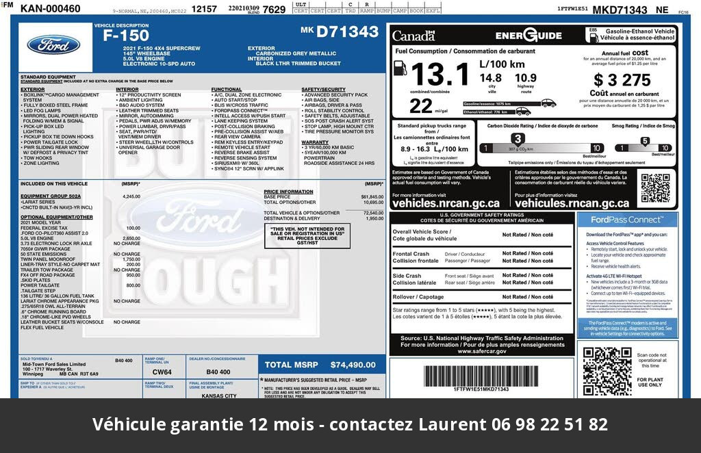 2021 Ford F150 Lariat Ethanol 5.0L SuperCrew 4x4 Tout compris hors homologation 4500e