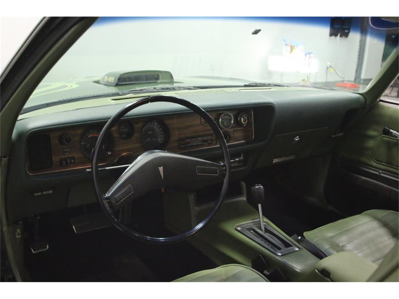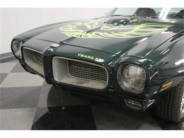 Repeint d'une nuance vive de vert foncé qui ressemble certainement au vert Laurentien traditionnel, ce Firebird est exactement le contraire de subtil. Oubliez toutes les blagues sur les poulets volants sur le capot, car ces graphismes emblématiques sont populaires pour une raison: ils donnent à cette voiture un aspect rapide assis sans bouger. Nous pensons que c'est précisément la raison pour laquelle le propriétaire a choisi d'inclure le décalque lors de la peinture. C'était apparemment une voiture propre et honnête avant le repeint aussi, et cela s'est avéré être un rappel ultra-précis de la performance des années 70. Pontiac lui a donné un look superbe avec un toit en vinyle, un pare-chocs avant légèrement agressif et un spoiler en queue de duc à l'arrière, qui restent en bon état. La peinture n'est pas parfaite, bien sûr, mais elle a un look génial qui '